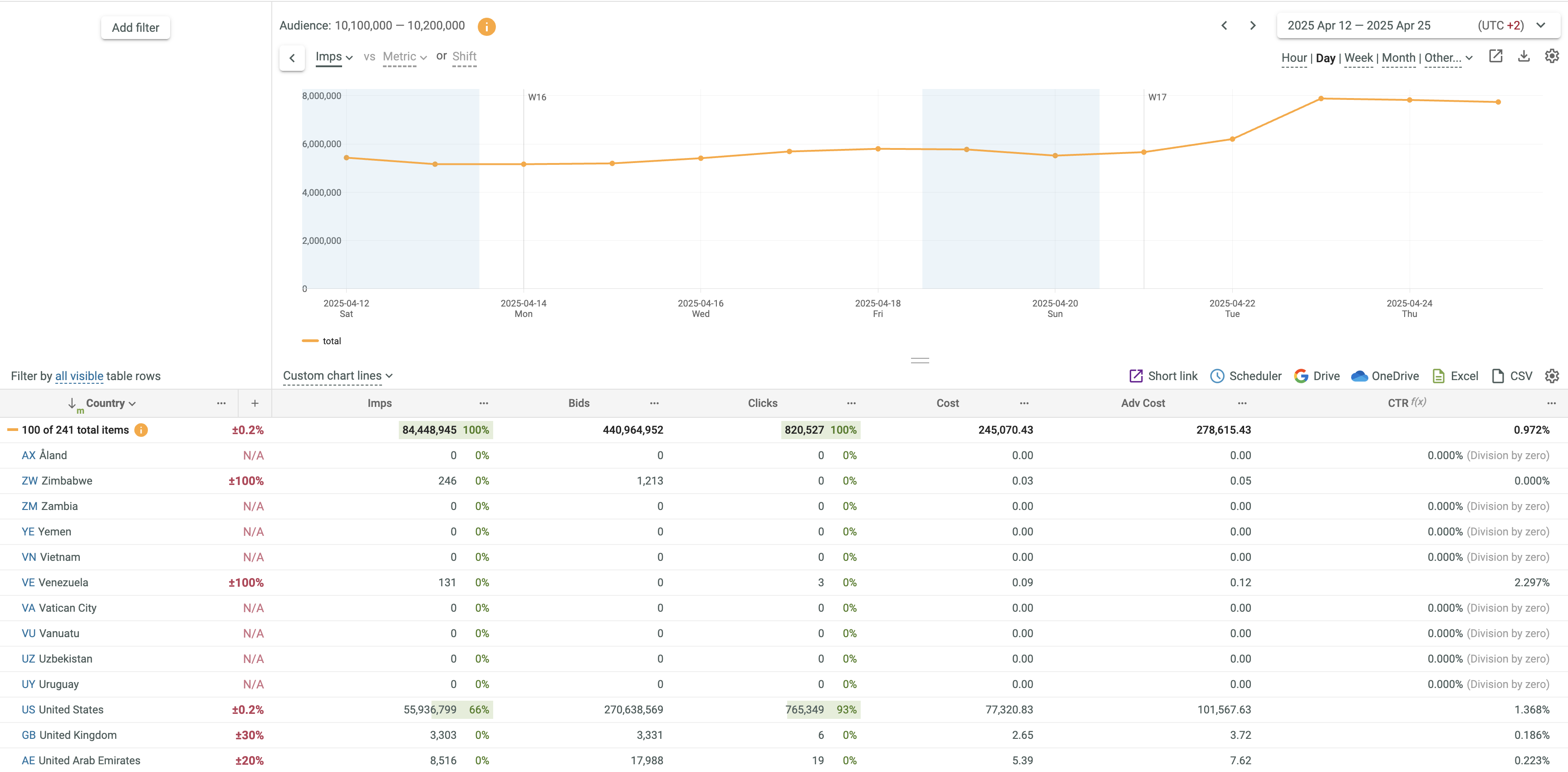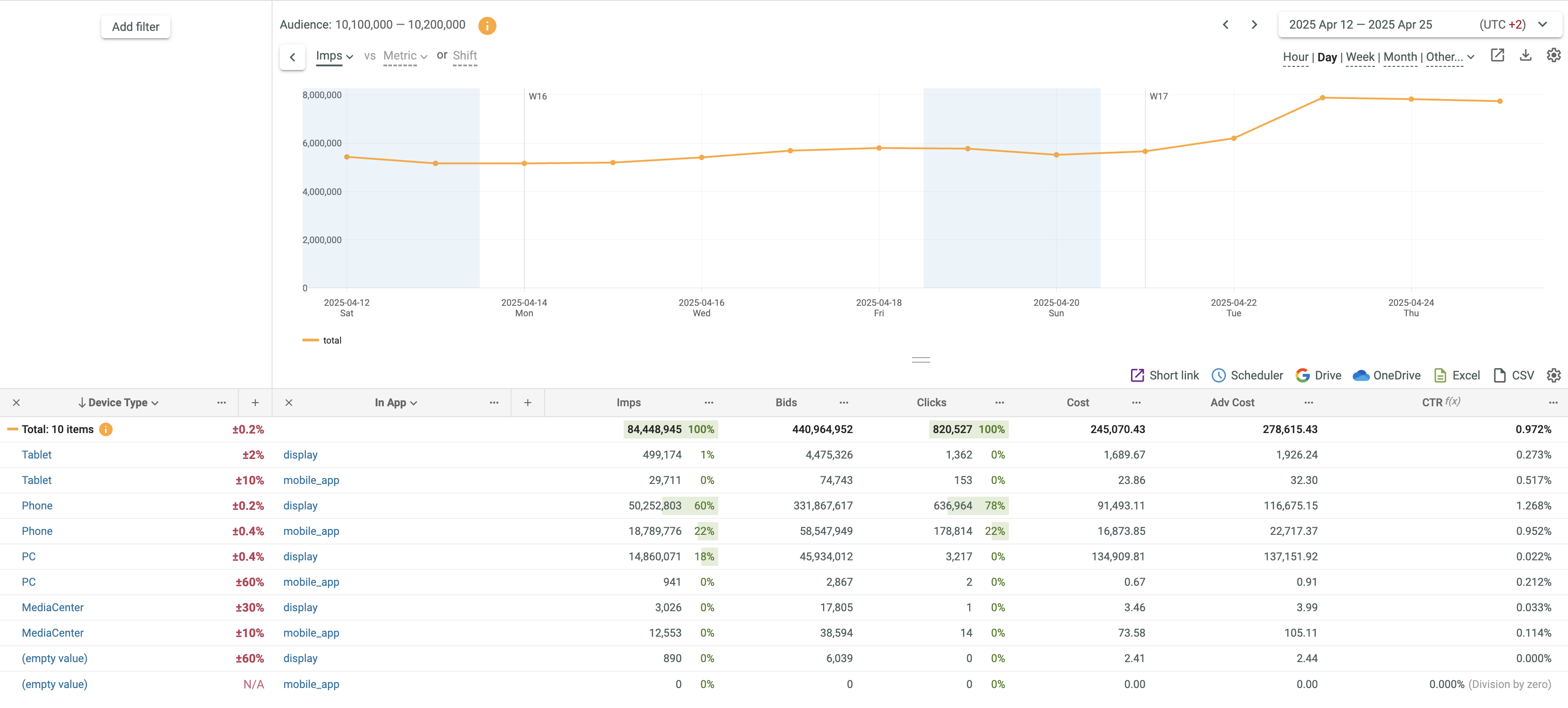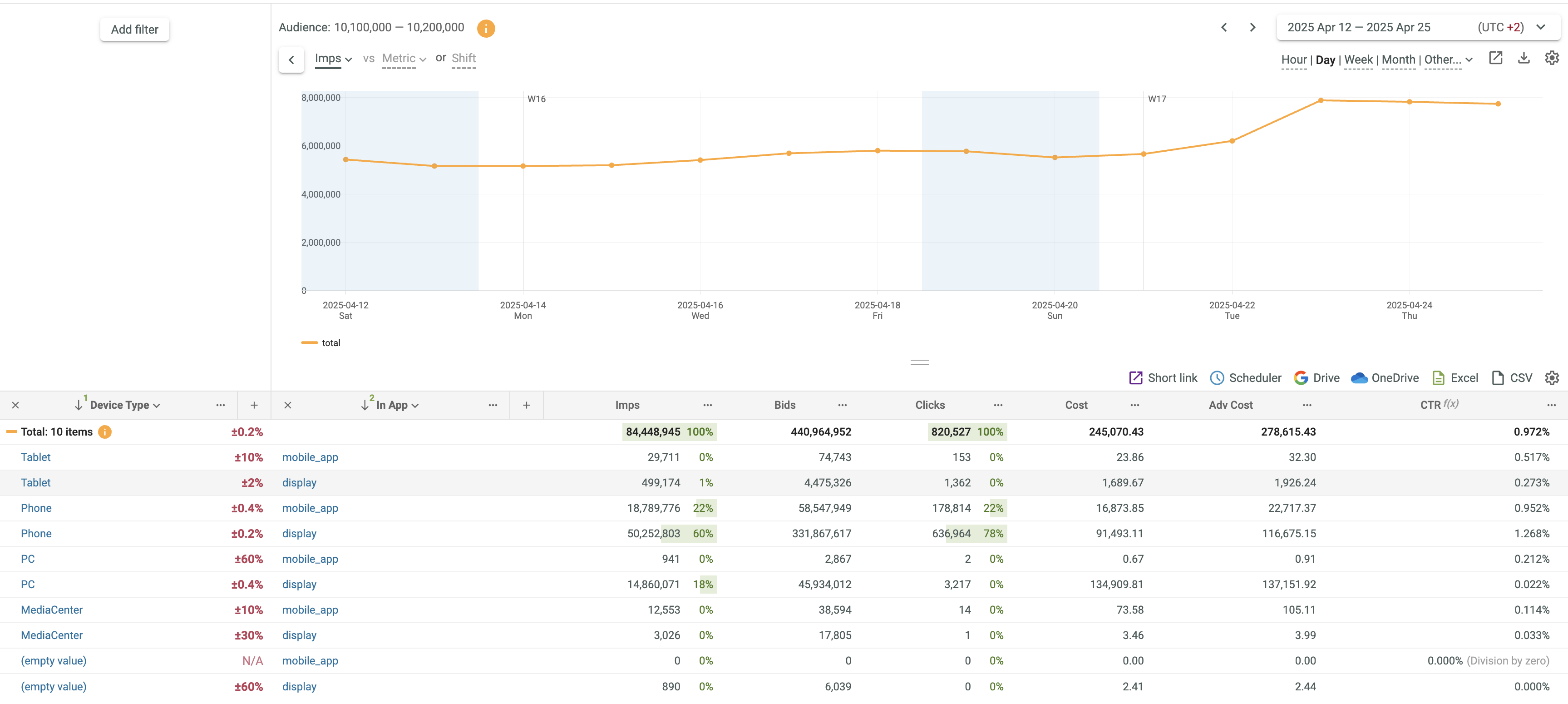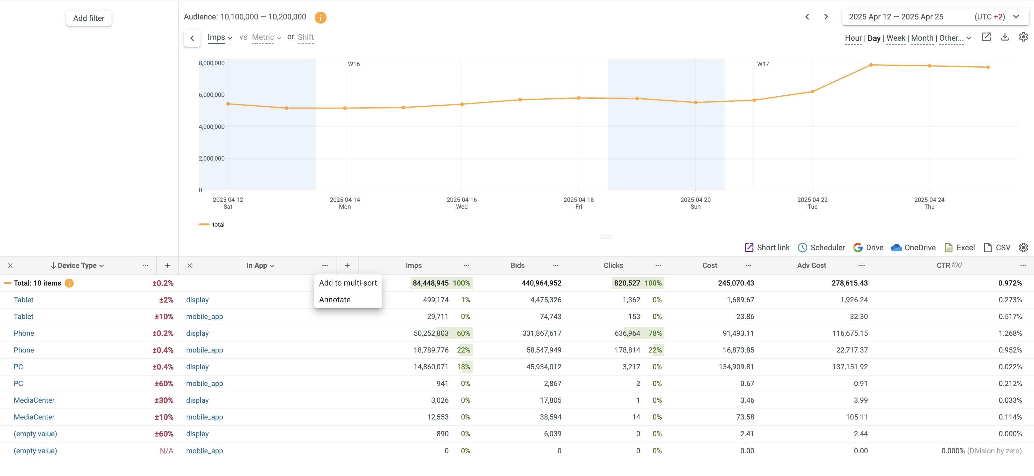• The 1 and 2 signs in the key field headers show that sorting is performed by two columns (first by Device Type and then by Browser).
